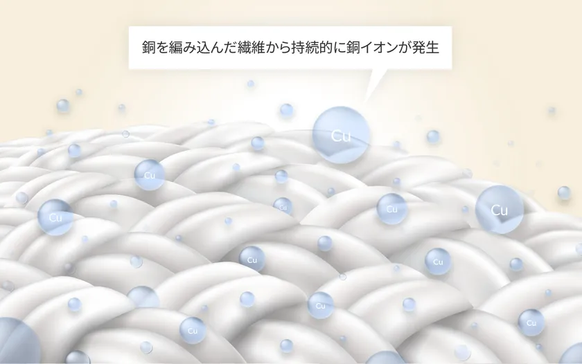 銅金属には本来、殺菌効果があるとされており健康維持にも必要不可欠なものとされており、人体や普段口にする食品にも銅が含まれていると言われています。そのような効果を持つ“銅”は靴下にも使用がなされ、白癬菌の除去や足特有の嫌な匂い除去にも活用されてきました。人体に良い影響を及ぼす銅の効果をより身近な物にしたいと思い、銅を繊維状にし様々な日用品に織り込むことで、銅の効果をより効率的に感じられるようにしたいと考えています。