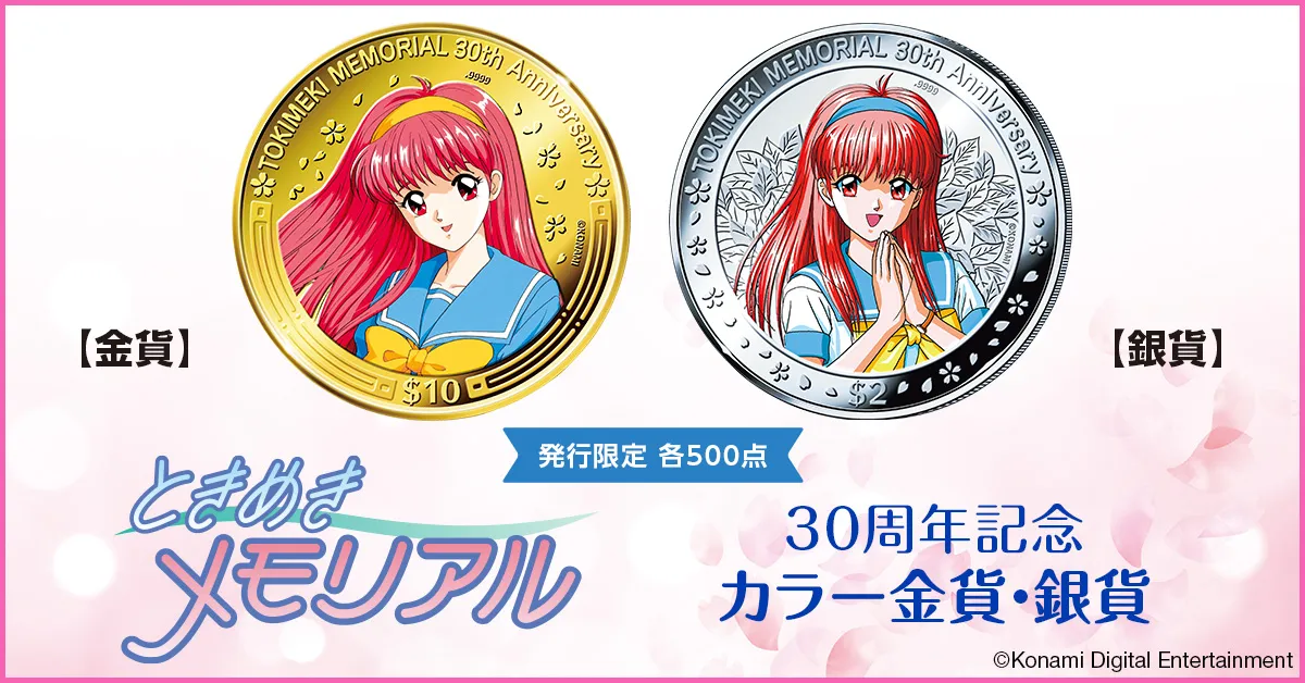 1994年に発売され、後にシリーズ化された恋愛シミュレーションゲーム『ときめきメモリアル』の30周年を祝して、永遠のヒロイン・藤崎詩織の姿が浮かび上がる金貨と銀貨が登場しました。