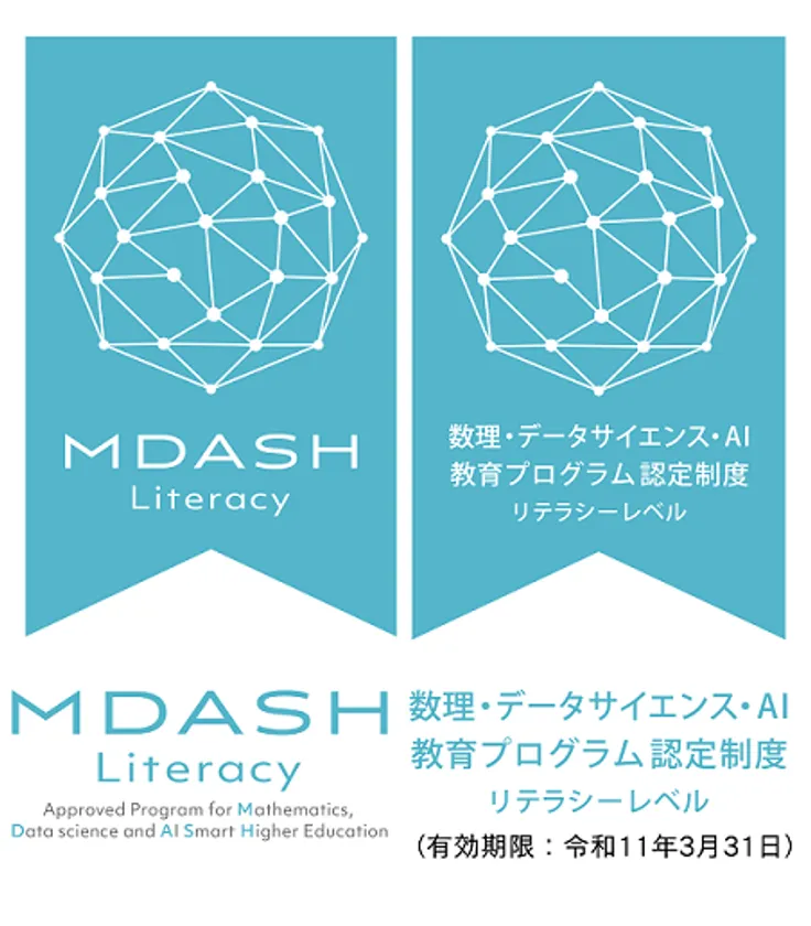 今回、認定を受けたリテラシーレベルは、データと社会との関係性を学ぶ「導入」、データを読み解き、扱うための基礎的な能力を学ぶ「基礎」、データやAIを利活用する際の倫理的・法的・社会的な留意点などを学ぶ「心得」などにより構成されており、大学等の全ての学生が身に付けておくべき素養として位置づけられています。