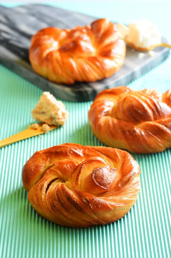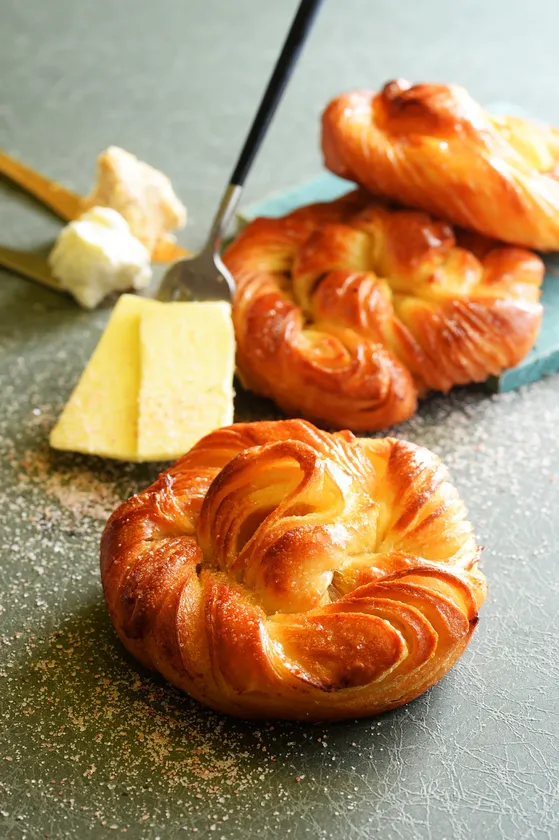 「LOOP」のクロワッサンベーグルは、“生乳と一緒に食べるベーグル”をコンセプトとし、北海道産小麦粉をメインに使用し、クロワッサン風の生地を独自の方法で伸ばし、成形時に捻りを加えることで、新食感のベーグルを作りました。
