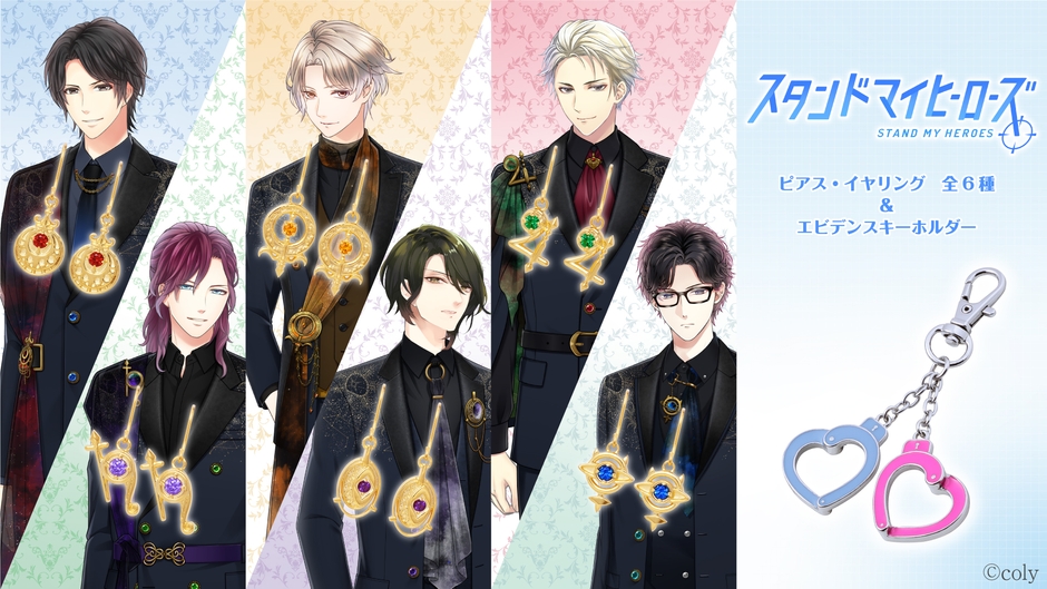 7周年衣装のブローチをイメージしたピアス/イヤリングと、エビデンスキーホルダーの全7種のラインアップ