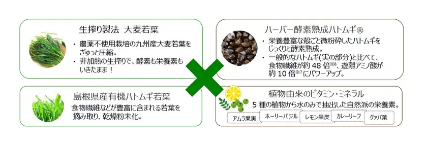 このような現況を踏まえて、ハーバーの『酵素熟成ハトムギ青汁』は、野菜の栄養素を手軽に効率よく摂取するため、植物原料の製法に着目しました。
