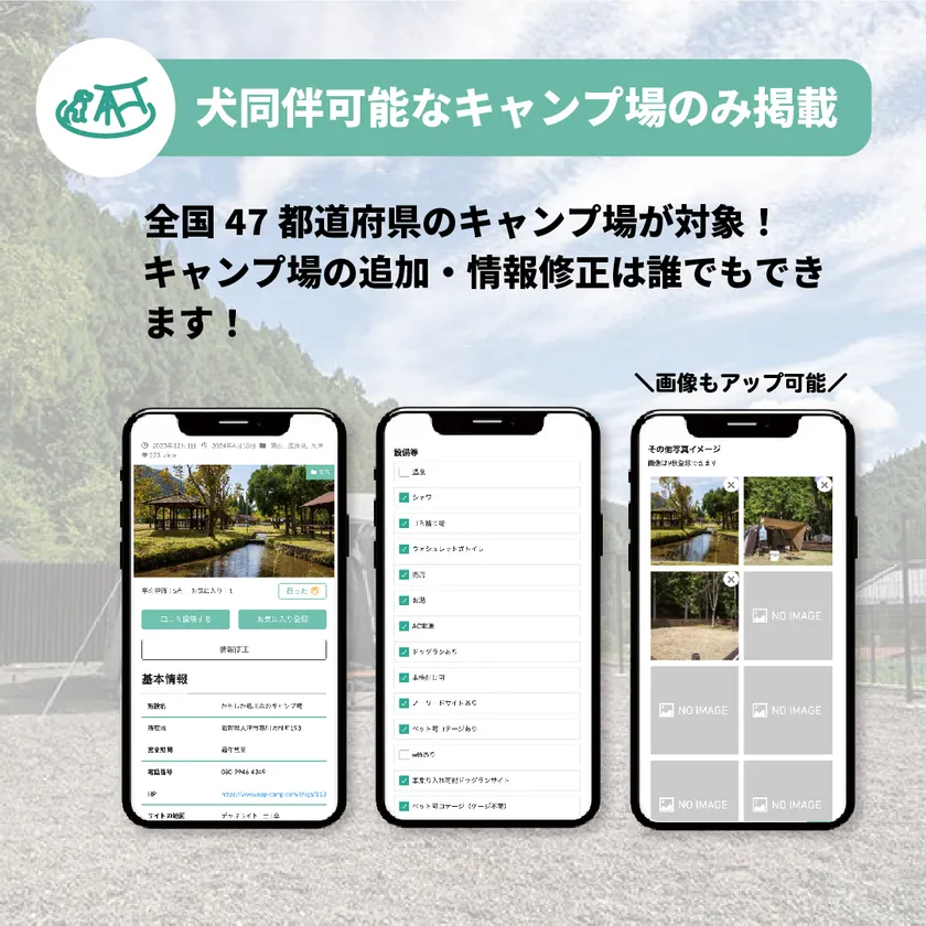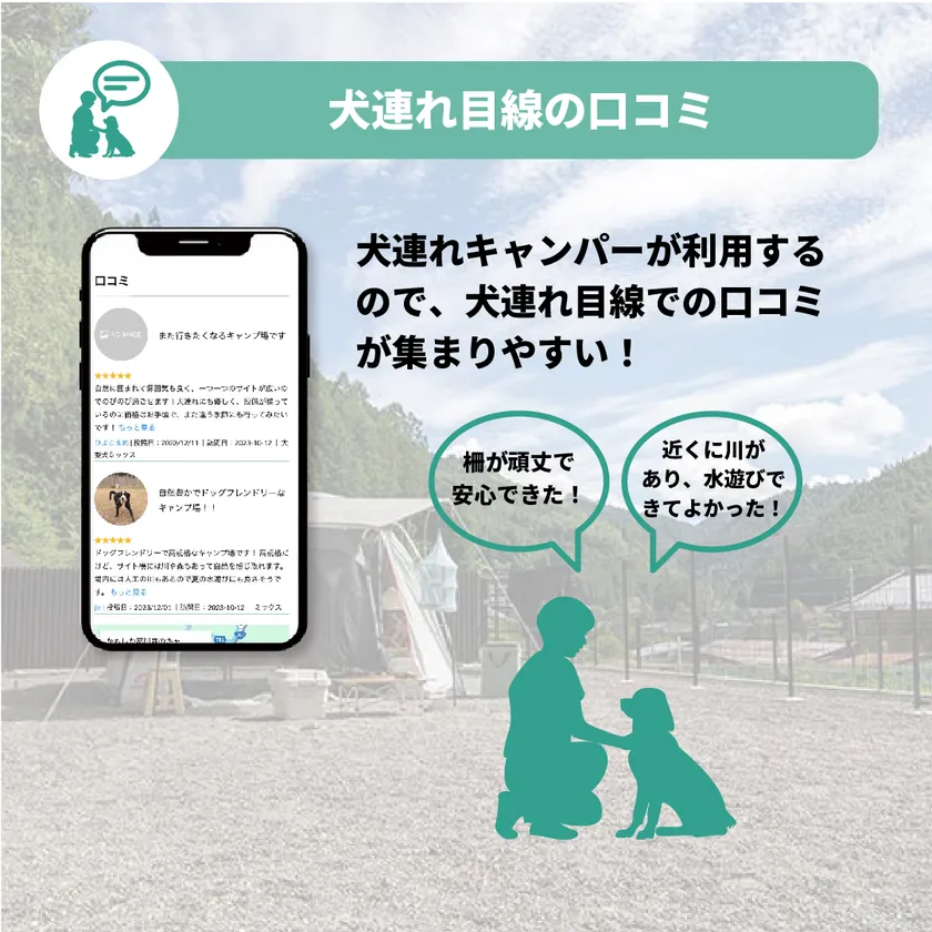 掲載しているキャンプ場は全てペット同伴可能なキャンプ場。ペット同伴可能なキャンプ場の中から、犬連れユーザーが知りたい情報で絞り込み検索をしたり、犬連れユーザー目線による口コミを投稿、確認できます。