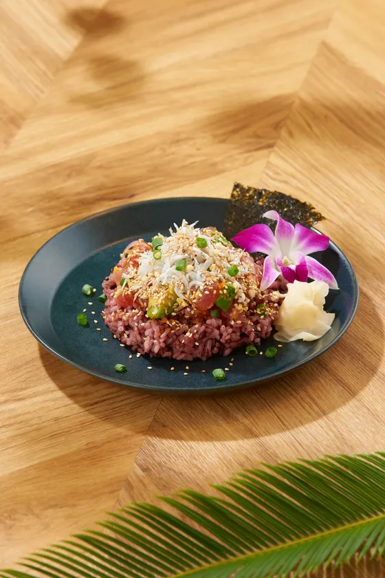 マグロとアボカドのポキボウルに湘南らしい食材、しらすをトッピング。ヘルシーな黒米を使用。鎌倉店ならではのメニューをお楽しみください。