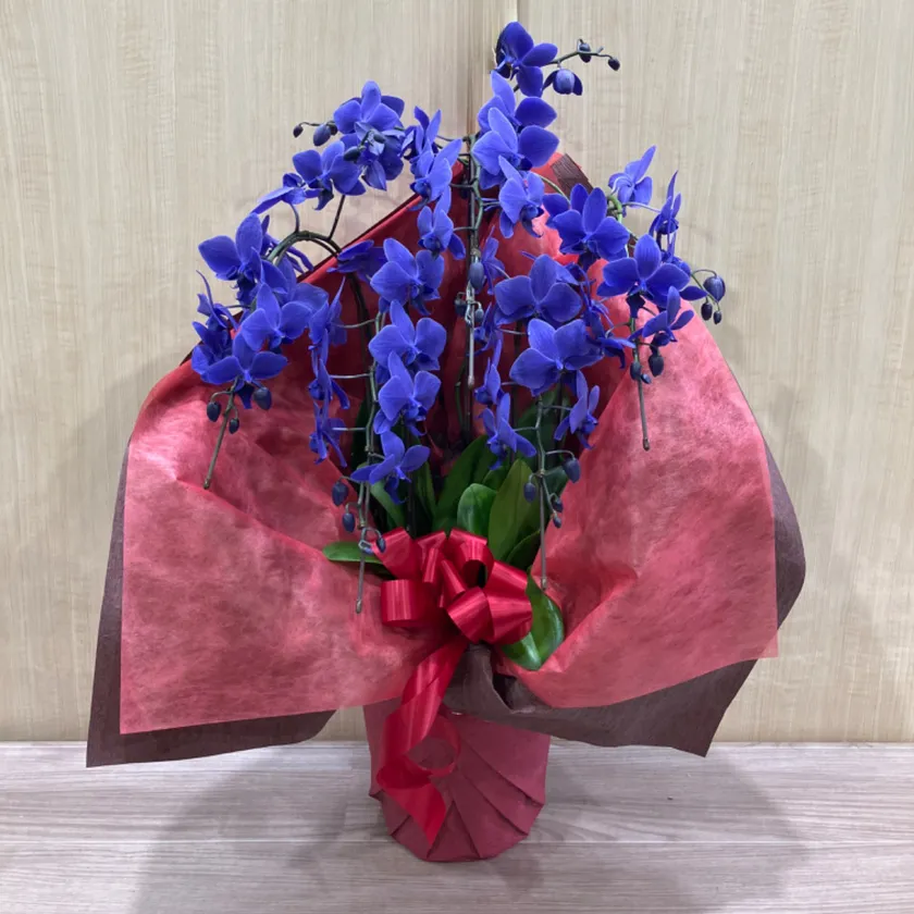 一般的に企業贈答用に用いられる大輪コチョウランに比べるとサイズは小ぶりとなりますが、その高貴な花色と希少性の高さで抜群の存在感を持つ商品です。