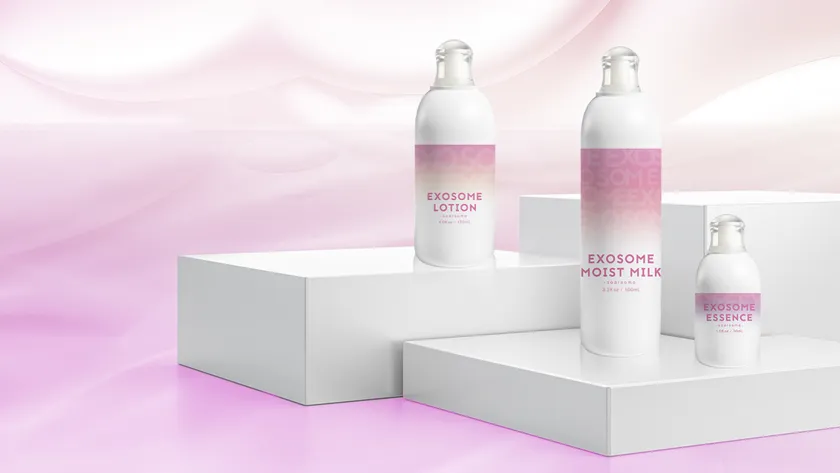 ヒト幹細胞培養液にも含まれている貴重な成分であるエクソソーム*1とは、細胞が放出する微小な胞体の一つで、細胞間の情報伝達の役割を果たしています。高配合*2されることにより細胞間のコミュニケーションが盛んに行われ、肌のハリや弾力などが期待できます。ビタミンC誘導体*3配合の「エクソソームミストローション」で肌のキメを整え、ナイアシンアミド配合の「エクソソームエッセンス」でうるおいを与えながら肌を整え、グルコシルセラミド*4配合の「エクソソームミルク」で整った肌を保護します。