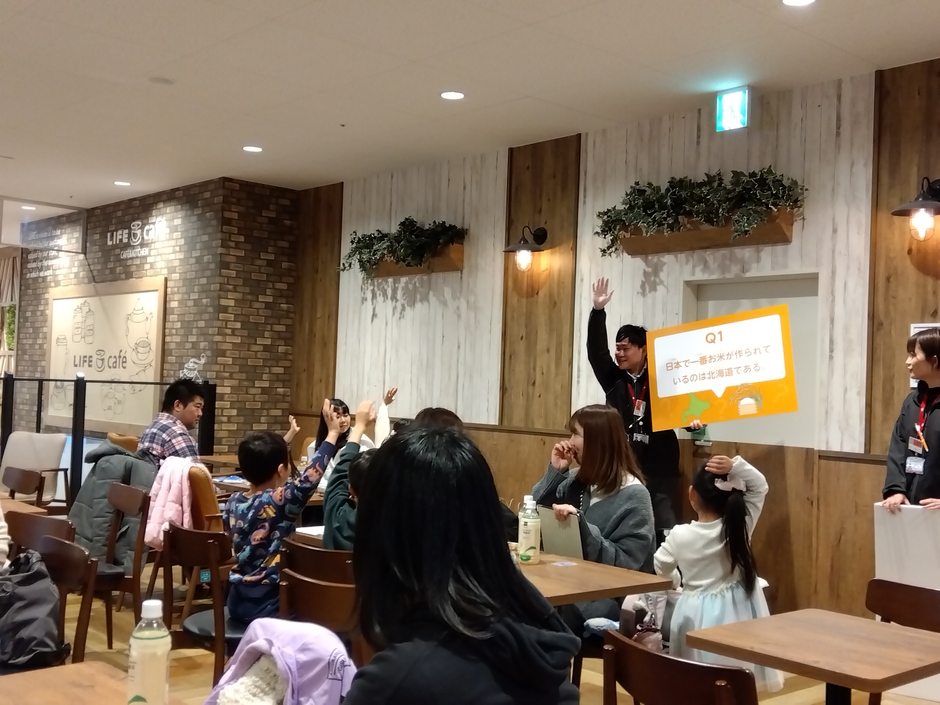 亀田製菓からは、お米はどうやって作られるのかの話やお米に関するクイズ、2種類のクッキーを食べ比べてどちらがお米から作られたクッキーかを予想してもらうゲームなど、楽しみながらお米のチカラについて学んでいただきました。