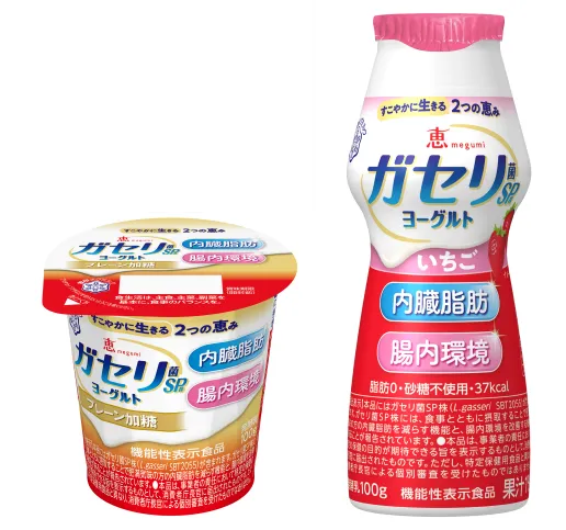 「恵 megumi ガセリ菌SP株ヨーグルト」シリーズは、2015年にヨーグルト史上初めての内臓脂肪を減らす機能性表示食品として発売しました。2024年秋、「肥満気味の方の内臓脂肪を減らす機能」に「腸内環境を改善する機能」をプラスし、これら2つの機能をもつ唯一のヨーグルトに生まれ変わります。
