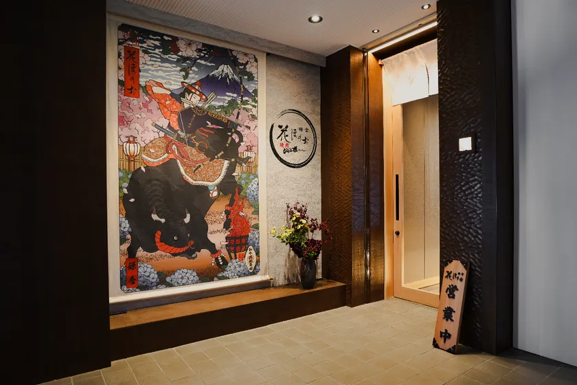 「あいざ鎌倉」の3階へ上がると、当店オリジナル描き起こしの鎌倉発祥の流鏑馬と黒毛和牛をモチーフとした浮世絵とロゴマークを配した高級感あるエントランスが出迎えてくれます。