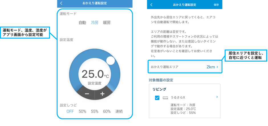 ・帰宅前に、予めアプリでお好みの温度と湿度に設定しておくことで、自宅に近づくと自動でエアコンが運転。お好みの温湿度で快適になったお部屋に帰ることができます(※自動運転での「おかえり運転」設定は、湿度のみが設定可能となります)。
