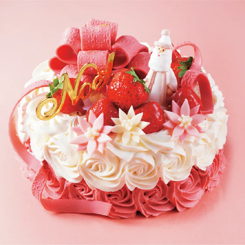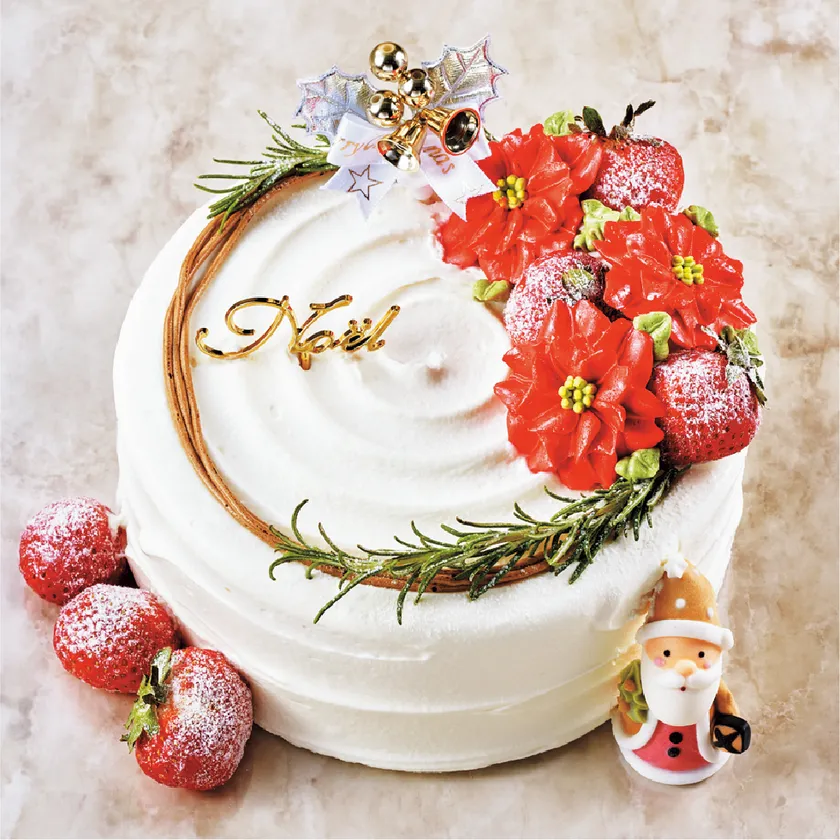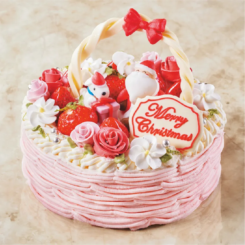 かごいっぱいにお花をいれた可愛く華やかなバスケット風ショートケーキ。かごに見立てた繊細な絞りの職人技が光る逸品です。可愛らしさを詰め込んだ特別なクリスマスケーキが、テーブルを華やかに彩ります。