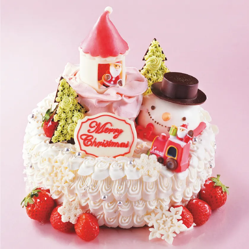 ふんわり食感のスポンジと甘さ控えめで口溶けのよい生クリームの絶妙なハーモニーのショートケーキ。中にはたっぷりと苺をサンドしました。チョコレートケーキのサンタのおうちとホワイトチョコムースのスノーマンが賑やかに盛り上げます。