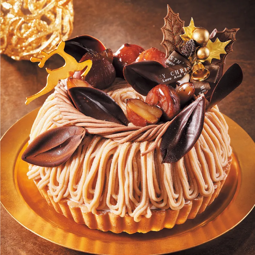 茨城県産の渋皮栗のペーストを使用したモンブランタルト。中にはチョコレートでコーティングしたサクサクのメレンゲと62%カカオを使用したしっとり濃厚なチョコレートスポンジを重ね、土台は濃厚なチーズタルトです。まるでモンブランのリースにトナカイが遊びに来たようなデコレーションに仕上げました。栗の美味しさを存分にお楽しみいただける特別感あふれる逸品です。