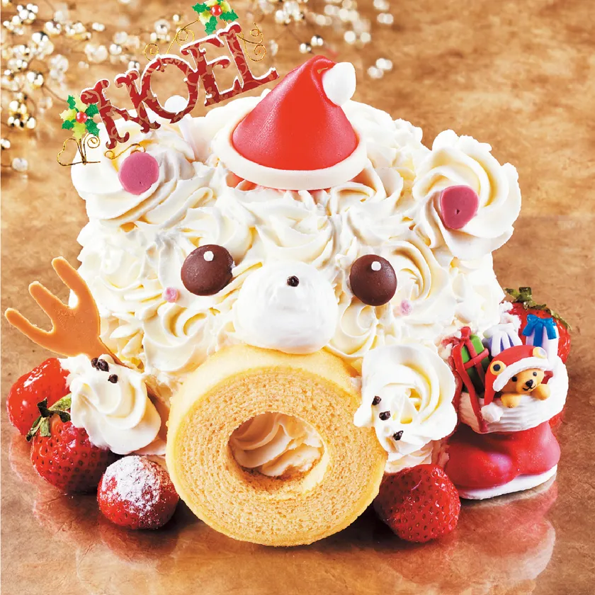 「アニバウム」とのコラボレーションした、ショートケーキもバウムクーヘンも楽しめる欲張りケーキ。ふわふわスポンジで苺と生クリームをたっぷりサンドした人気のショートケーキ。クリスマスベアの手には、こだわり素材で作られたバウムクーヘン専門店「アニバウム」のプレーンバウムを持たせました。