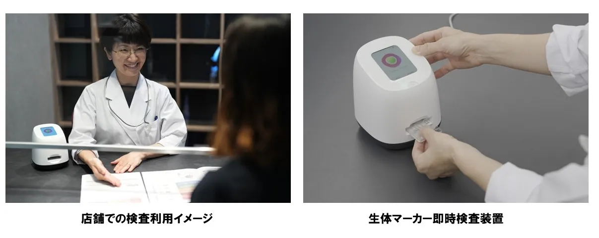 近年、健康寿命の延伸に向けた予防医療が推進され、未病段階で健康状態の正確な把握と適切な対策を行うことが重要視されています。このたびマイライフと京セラは、体内のエクオールの産生量を即時に測ることができる「生体マーカー即時検査装置」を使用したサービスについて、有償での実証実験を開始します。本装置は、生体試料を利用して、その場で栄養などの成分情報を測定し即座に結果を提供するもので、京セラのSAWバイオセンサーが生体試料に含まれる成分に反応し、その電気信号を測定することで、成分を特定します。本サービスでは、尿中のエクオール濃度を定量的に測定し、各人の体内におけるエクオールの産生量を示し、測定結果に応じた対策を提案します。