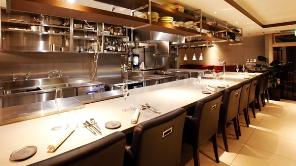 『Restaurant ai』の店内中央には、調理工程が見られるフルオープンキッチンが設置されています。