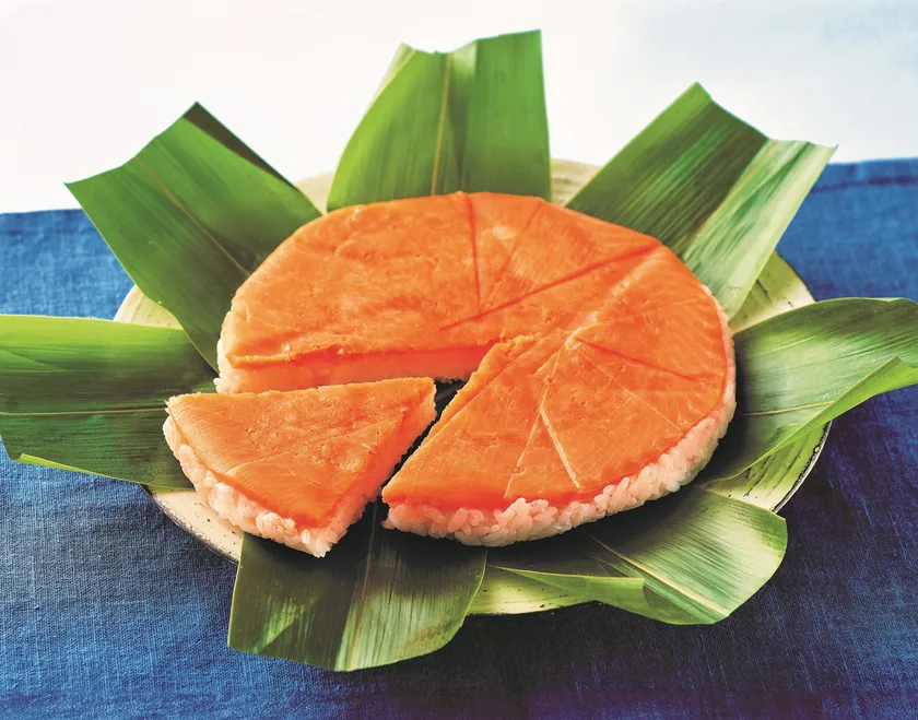 ほどよい脂ののったますにほんのりと甘いすし飯、緑が濃く香りの良い笹を使用。1つ1つふんわり加減の手押しで仕上げた一品。