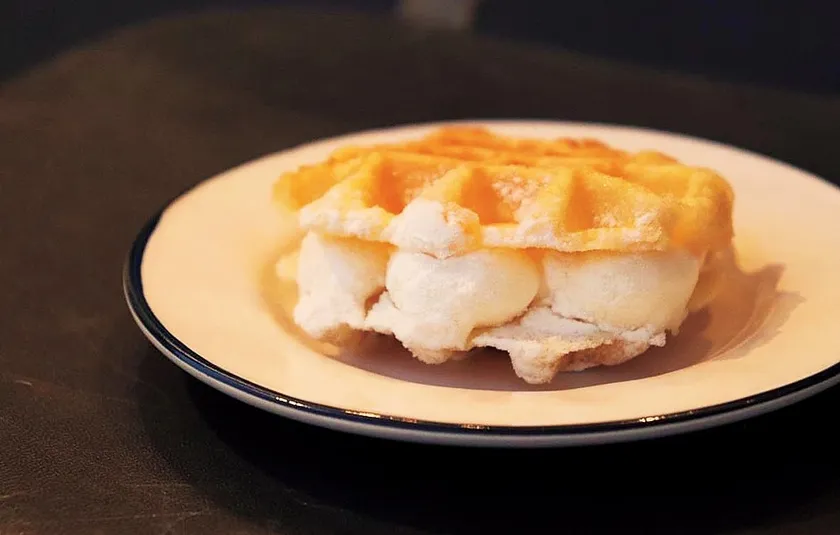 能登のミネラル豊富で旨みのある塩をチーズクリームにちらし、北海道産のチェダーチーズを粉末にして振りかけたリエージュタイプのワッフル。