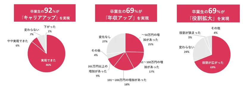 卒業生への受講後アンケートから得られたデータによると、多くの卒業生がキャリアアップ、年収アップ、役割拡大を実現しています(※)。