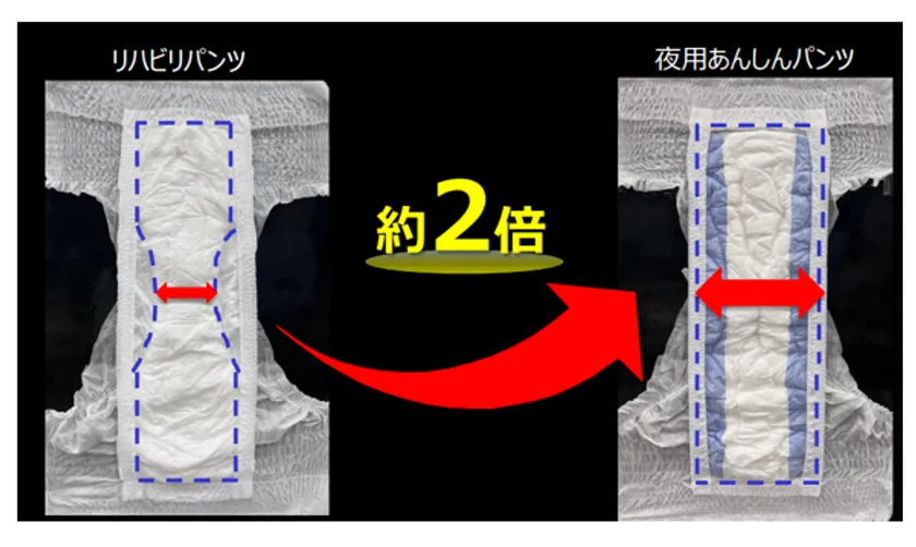 ・股下の吸収体の幅が約2倍に広がり、モレが心配な足周りにも吸収体を追加しました。