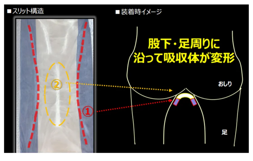 ・独自のスリット構造により、吸収体が体に沿って変形し、股下から足周りまでフィットします。