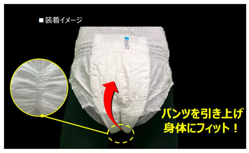 ・股下フィットギャザーがパンツを引き上げ、吸収体を体に密着させ伝いモレを防ぎます。