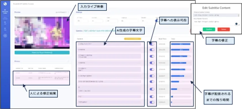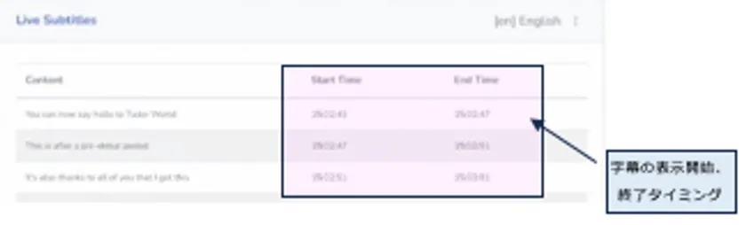 通常、ライブ中に人手で会話内容を字幕化して配信する場合、テレビのニュース番組の字幕のように、音声が流れた後、しばらくしてから字幕が表示されますが、当社の字幕機能では、AIで認識された音声の発生タイミングを正確に記録することで、字幕の表示位置を音声の発生タイミングに同期させて表示することができます。