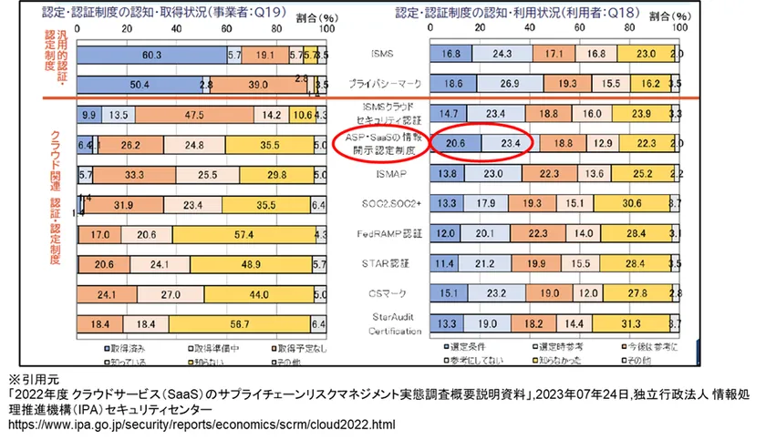 2022年、独立行政法人情報処理推進機構(IPA)は、クラウドサービス利用者がSaaS選定の際に参考としているクラウドの認定や認証制度について大規模なアンケート調査を実施しました。その結果、44%の利用者がASPICの情報開示認定制度を選定条件もしくは選定時の参考にしている事が判明し、他の認定・認証制度よりもまず、情報開示認定を参考にしていただいている実態が明確になりました。(図-2)