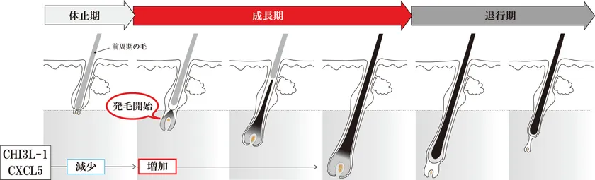 はじめに、一時的な負荷(テストステロンなど)を与えた毛乳頭細胞は、負荷から解放された際に、毛を作る細胞(毛包細胞)の増殖を促進させることを見出しました。つぎに負荷から解放された毛乳頭細胞について遺伝子発現を解析した結果、約6万種の遺伝子の中から、CHI3L-1およびCXCL5が毛包細胞の増殖を促進するタンパク質であることを特定しました。さらに毛周期において、両タンパクともに、新しい毛が生まれる「成長期初期」に増加し、発毛しない「休止期」に減少が確認されました(図2)。以上の研究成果より、CHI3L-1およびCXCL5が発毛に関わる因子であることを世界で初めて発見しました※4。