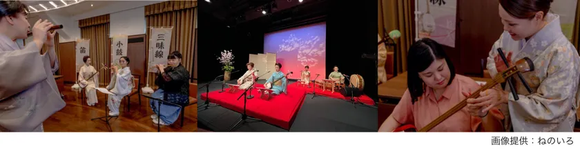 ・内容:プロ演者による伝統音楽の演奏を鑑賞したのち、演者の指導のもとで三味線、笛、小鼓のいずれかのお稽古体験をします。最後には、参加者全員での合奏のほか、芸者の登場など、江戸の和楽器文化を体験できるプログラムです。