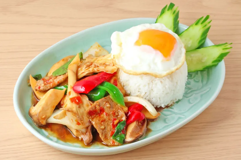 タイの屋台や食堂で人気No1メニューのガパオライス。当社では上品な風味と香りが楽しめる白舞茸とコリコリとした食感が楽しいエリンギを加えて秋の訪れを感じることの出来るメニューを開発しました。揚げた目玉焼きの黄身を混ぜながらお召し上がりいただきたい1品です。