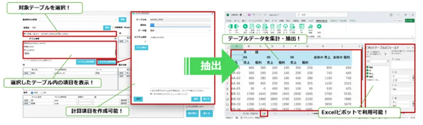 BI機能(Pivot機能)では、スマコレのデータベースから任意のテーブル・ビューを選択し、Excelに出力したい項目を指定することでExcelのPivotテーブル形式でデータ抽出を行うことができます。