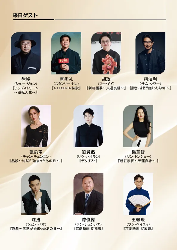授賞式にはシュー・ジェン(徐崢)、リウ・ハオラン(劉昊然)、フー・メイ(胡玫)等中国映画界を代表する豪華来日ゲストに加え、各賞のプレゼンターとして、日本映画界からも素晴らしい豪華ゲストが登壇します(各種チケットは10月8日販売開始)。