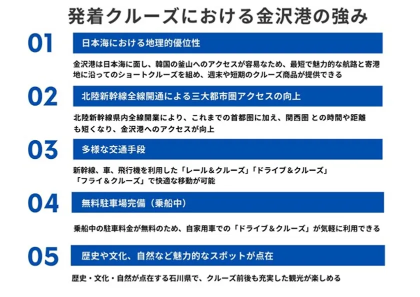 2024年3月の北陸新幹線県内全線開業により、これまでの首都圏に加え、関西圏との移動時間や距離も短くなり、石川県へのアクセスが向上しました。これを契機として、金沢港及び背後観光地の魅力を紹介するプロモーションを通して、金沢港の認知度を向上させ、発着クルーズ(2024年9月時点での金沢港発着クルーズ船:飛鳥II/にっぽん丸/コスタ セレーナ)の拡大を図ります。