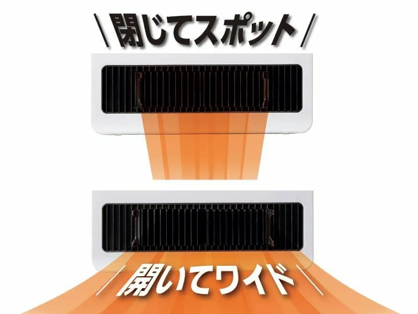 本製品はルーバーを閉じるとスポット温風、開くとワイド温風にできる開閉ルーバー付きセラミックヒーターです。