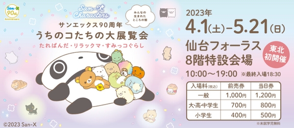 仙台フォーラスでは サンエックス 90 周年を記念した展覧会 「 サンエックス 90 周年 うちのコたちの大展覧会 」を4月1日より東北初開催 致します。本展は「たれぱんだ」「リラックマ」「すみっコぐらし」を中心に「アフロ犬」「こげぱん」「みかんぼうや」「センチメンタルサーカス」など きっとみなさんも一度は目にしたことのあるサンエックスのこれまでの キャラクターが大集合する、サンエックス史上最大規模の展覧会 です。会場内には初公開となる原画や資料、ここでしか見られないキャラクターの映像や立体作品、ぬい撮りできるスポットなど皆様に楽しんで頂けるスポットがたくさんございます。