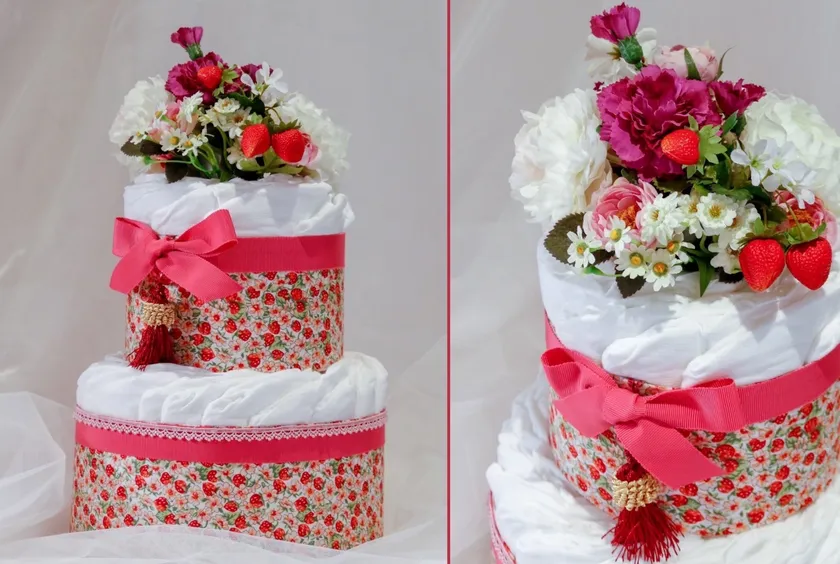 シャルムレクランのダイパーケーキは赤ちゃんの成長と共に変化していきます。まずは、赤ちゃんが小さい時はオムツケーキとして飾っていただけます。赤ちゃんがオムツを使い始める頃には、ダイパーケーキからオムツを取り出してお使いいただきます。