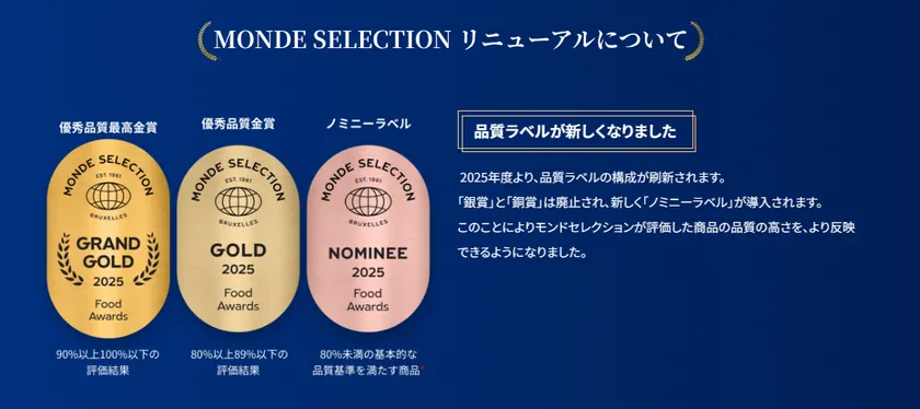 「MONDE SELECTIONによる今回の刷新は、受賞商品が高品質であると認識し、推進する能力の向上を目的としています。現在、「銀賞」または「銅賞」を受賞している製品について、3年間のライセンス期間中は引き続きご利用が可能です。ただし、これらの賞は2025年度以降更新されませんのでご注意ください」と付け加えました。
