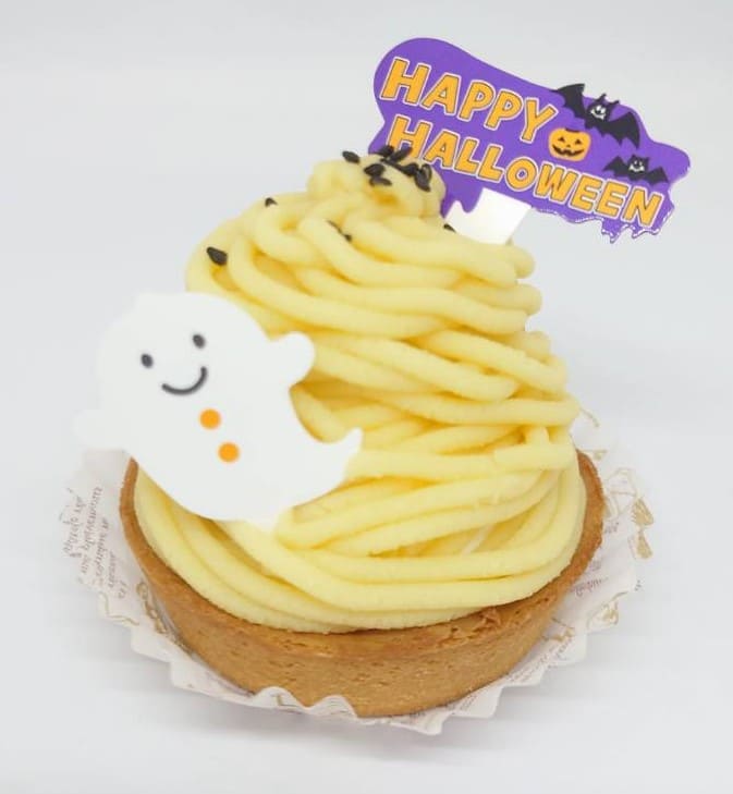 サクサク生地のチーズタルトの上に鳴門金時のおいもモンブランクリームを絞りました。可愛いおばけをトッピングしたハロウィン限定商品です。