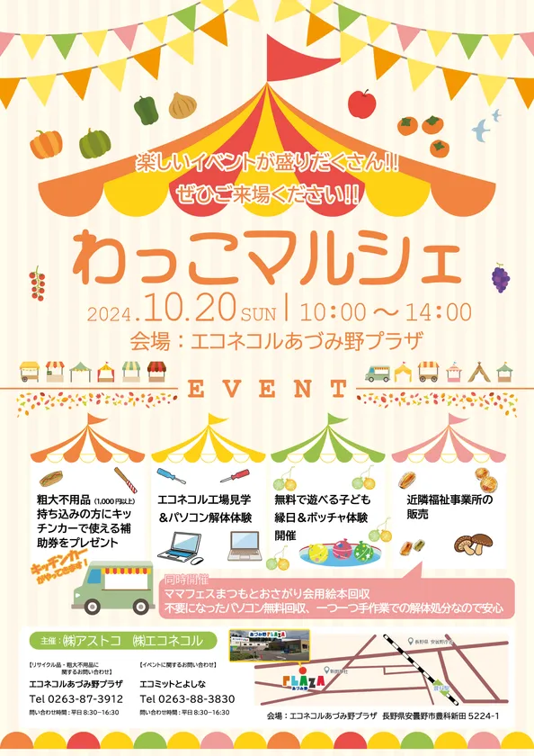 株式会社エンビプロ・ホールディングスのグループ会社である株式会社アストコ、株式会社エコネコルの共催によるイベント「第2回わっこマルシェ」を、2024年10月20日(日)、長野県安曇野市のリサイクル施設「エコネコルあづみ野プラザ」にて開催します。