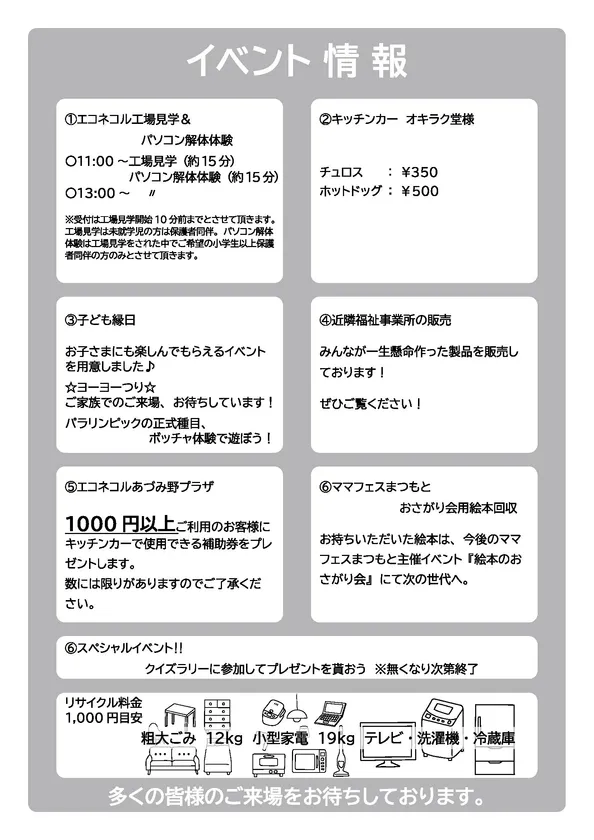 当日はリサイクル工場の見学やパソコン解体の作業体験のほか、地域の福祉事業所からの出店や、ママフェスまつもとのおさがり会用絵本回収、ボッチャ体験、子供縁日などイベントが目白押しです。