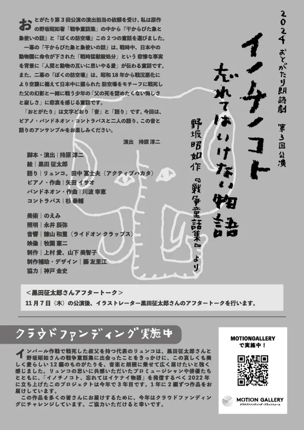 福岡の博多で料理店を営むリュンコ(本名:森温子)が代表を務める『イノチノコト、忘れてはいけない物語』実行委員会は、3回目の実施となる朗読劇『おとがたり「イノチノコト、忘れてはいけない物語」~野坂昭如作『戦争童話集』より~』を、ぽんプラザホール(福岡市博多区)にて2024年11月7日(木)、8日(金)に開催します。また本公演に先立ち、9月より「MotionGallery」でクラウドファンディングを11月6日まで実施。集まった支援金を今回の公演制作費や今後の継続開催資金として使用いたします。