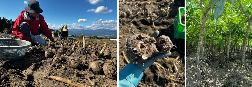 (左)コンニャクイモ収穫風景、(中)新芋、(右)夏のコンニャクイモ畑