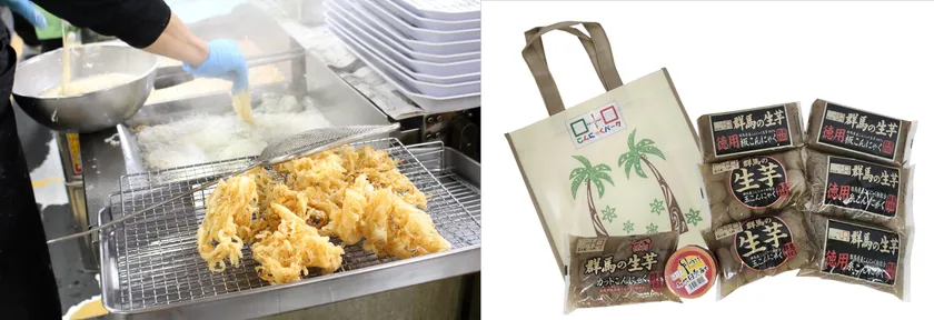 (左)しらたきのかき揚げ調理風景、(右)2024新芋祭り・限定生芋こんにゃくセット