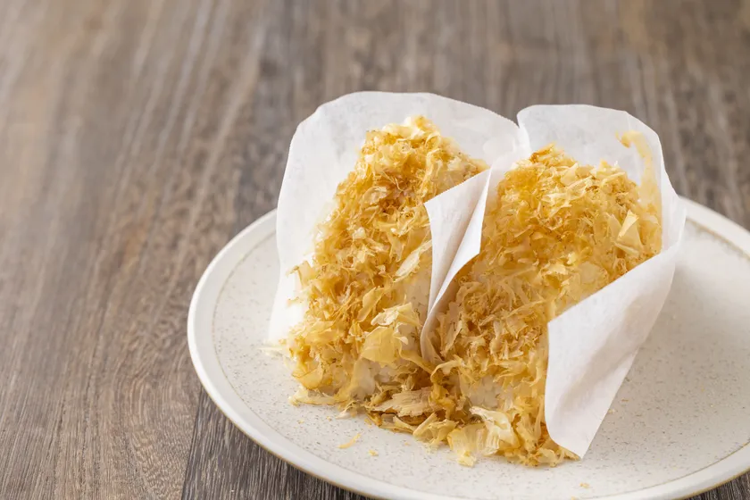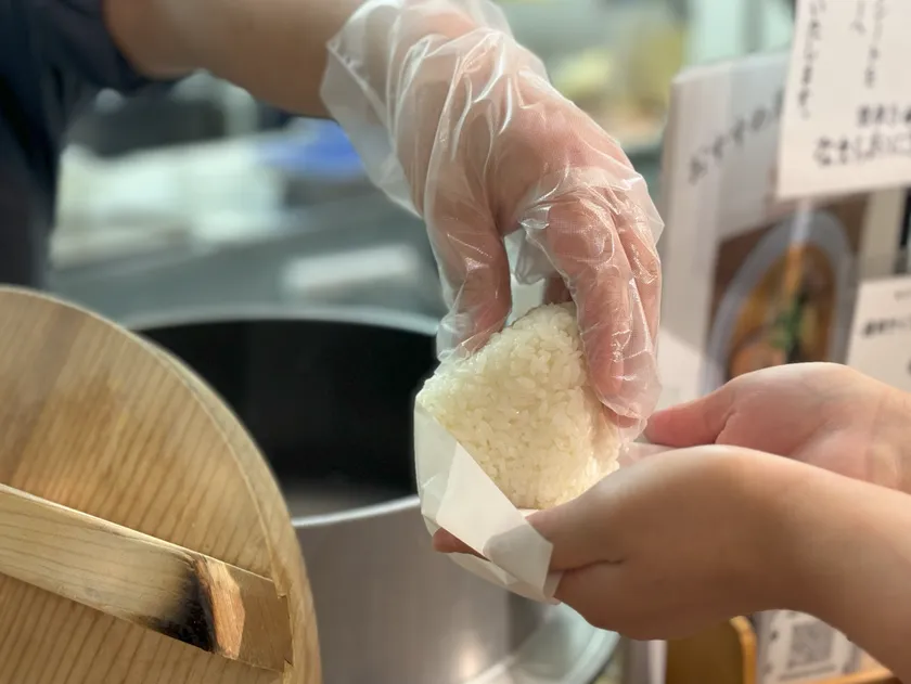羽釜で炊き上げた北海道産「ななつぼし」を使った特製おにぎり。北海道産昆布醤油を混ぜてふわふわ鮭の削り節をまぶしており、一口頬張ると香ばしい風味が広がります。