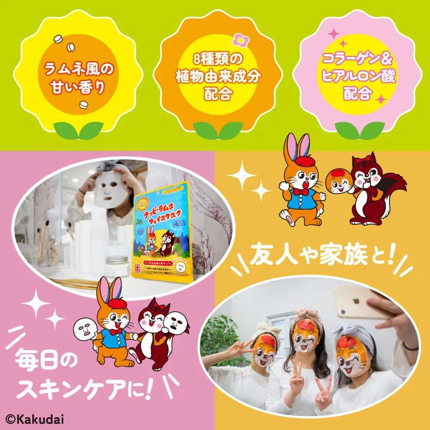 「クッピーラムネフェイスマスク」は、クッピーラムネの愛らしさや懐かしさを感じながら、楽しくお肌のケアができるひとときを過ごしてほしいという想いが込められています。ご家族やご友人とぜひ一緒にお楽しみください。