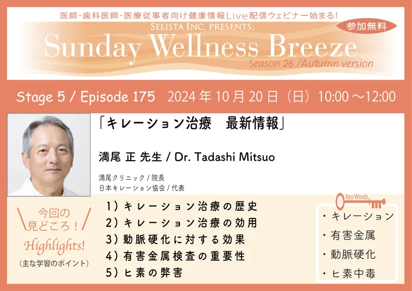 セリスタ株式会社(東京都千代田区、代表取締役:伊藤 承正)は、2024年10月20日(日)に、満尾 正 先生(満尾クリニック/院長)を講師にお迎えし、医師・歯科医師などの医療従事者向け無料ZOOMオンラインセミナー『キレーション治療 最新情報』を開催します。