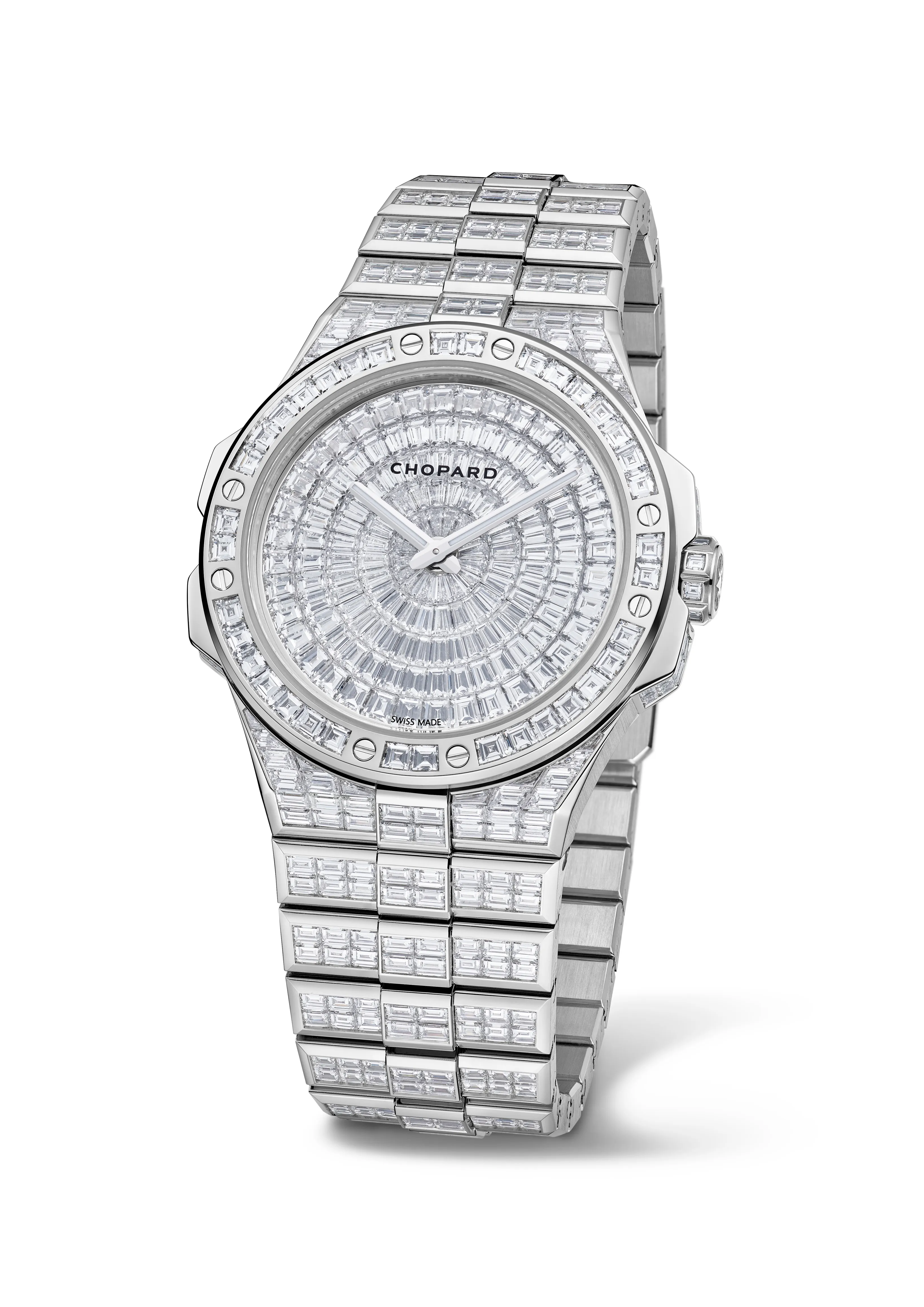18Kエシカルホワイトゴールド製ケース&ブレスレット、自動巻き、41mm径、バゲットカットダイヤモンドをセットした文字盤