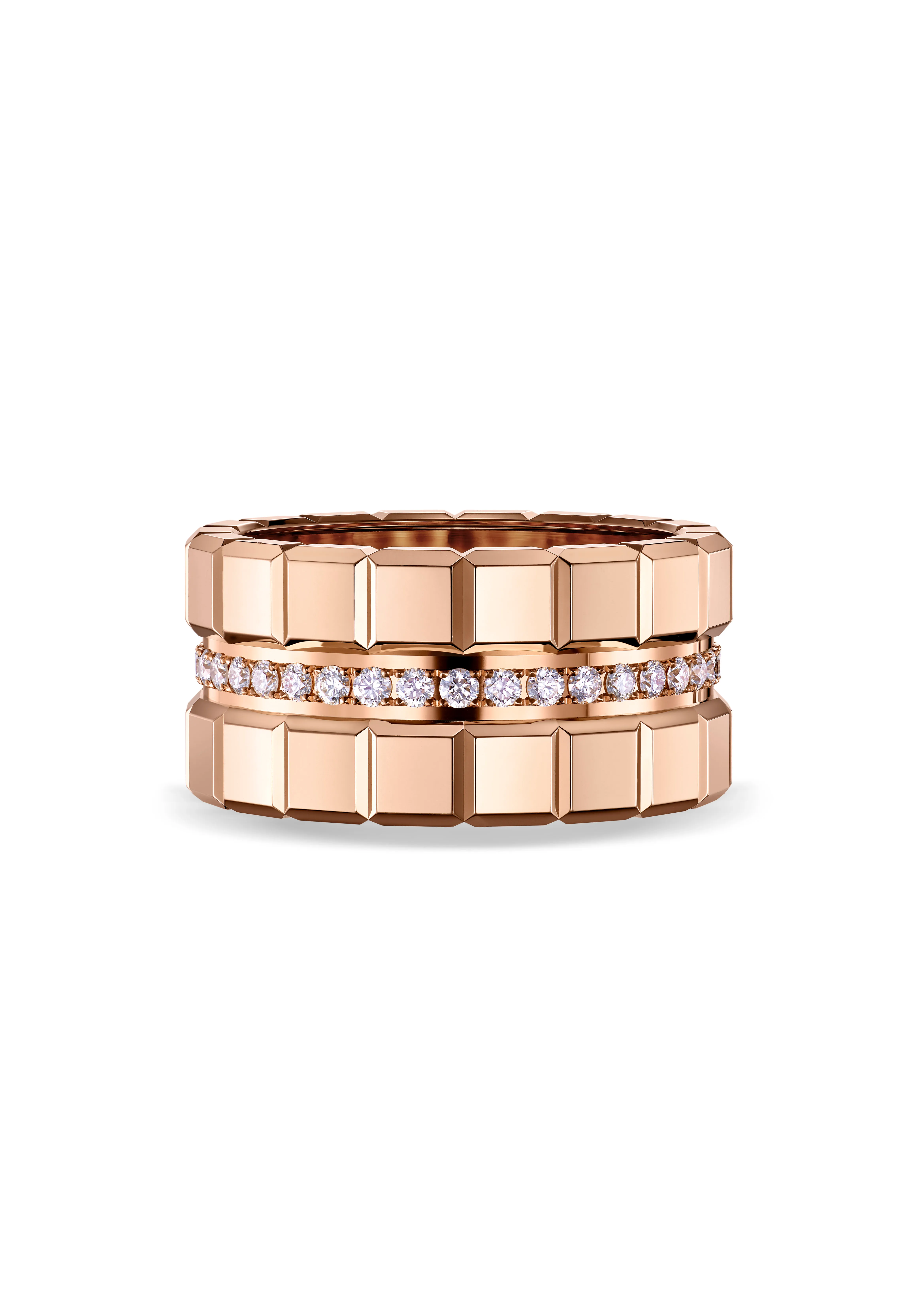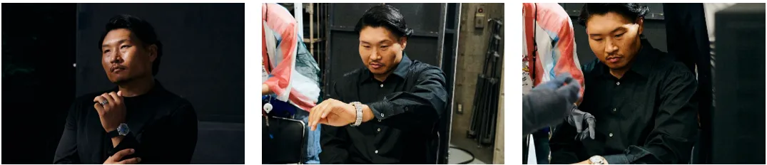 僕、角ばったものが好きなんです(笑)。キューブが連結しているところがアイスキューブの好きなポイントです。連結したキューブだからこそ、光り方が様々で、他とは違うんです。撮影時に着用したローズゴールドは、リングのセンターにダイヤがセットされているので、キューブとダイヤの輝き方のコントラストがすごく綺麗に見えるんです。そして、ローズゴールドのアルパインイーグルのブレスレットのファセットとの重なりもすごく素敵だなと思いました。