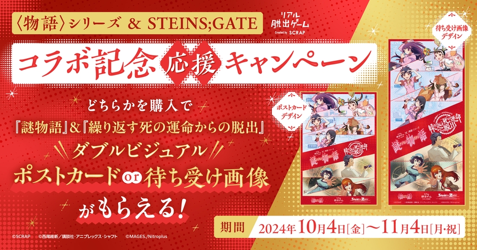 世界中で累計1,300万人以上を動員しているリアル脱出ゲームを企画運営する株式会社SCRAP(本社:東京都渋谷区、代表:加藤隆生)は、今年2024年にTVアニメ化15周年を迎えた「〈物語〉シリーズ」と、来る10月15日(火)にゲーム発売15周年を迎える「STEINS;GATE」とのコラボを記念して、2024年10月4日(金)から11月4日(月祝)まで、それぞれの作品とコラボしたリアル脱出ゲーム『謎物語』および『繰り返す死の運命からの脱出』を対象とした特別キャンペーンを開催いたします。
